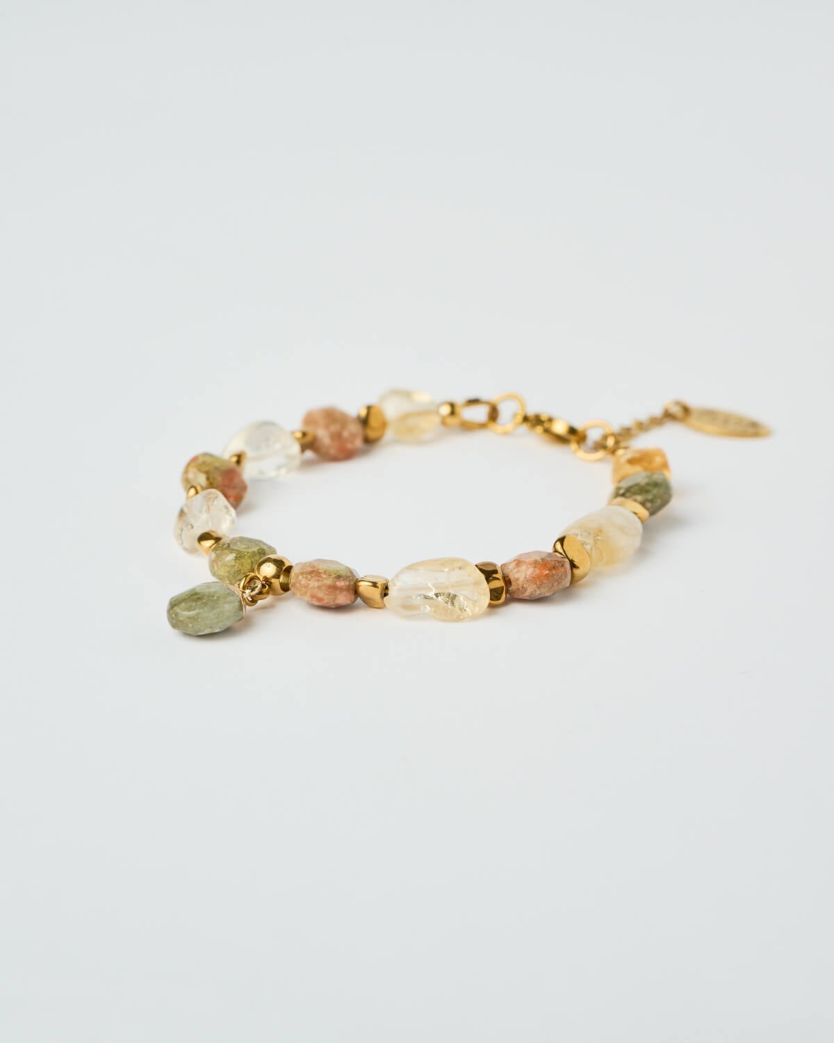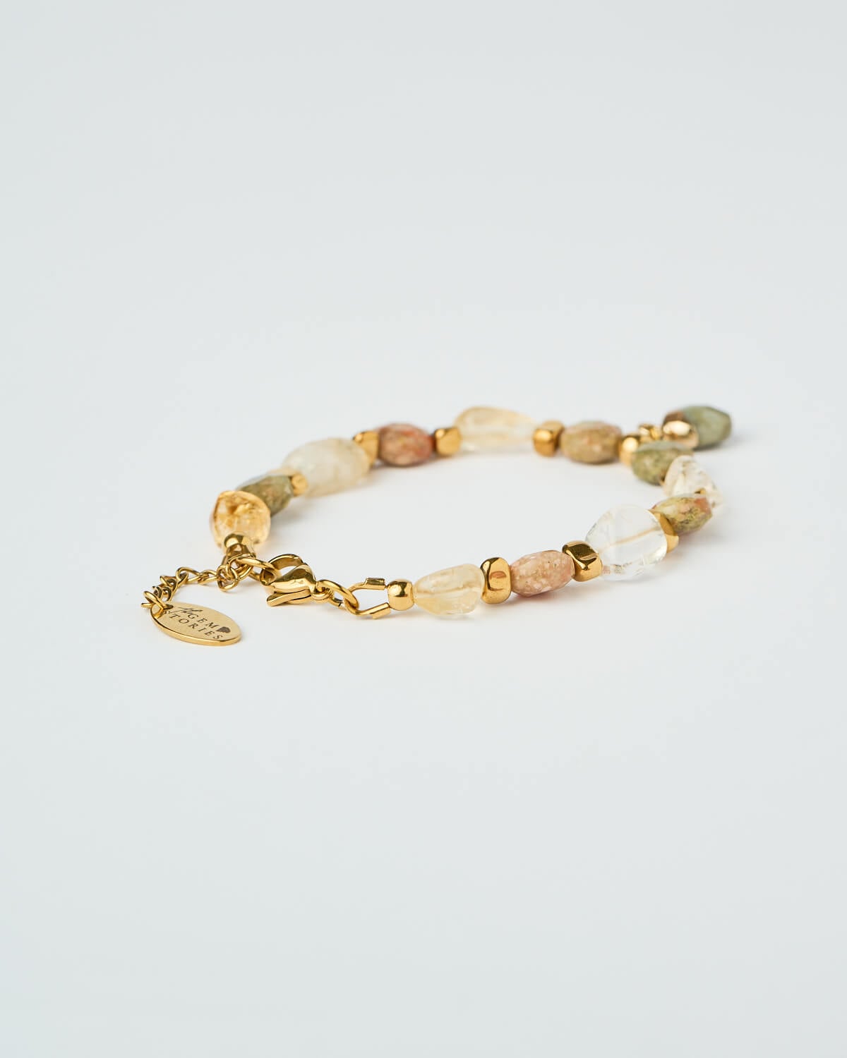 Στην καρδιά του Βραχιολιού Desert Harmony βρίσκεται μια επιλεγμένη συλλογή από φυσικές πέτρες σε ζεστές μπεζ, απαλές μελί, ήπιες πράσινες και γήινες αποχρώσεις. Αυτά τα χρώματα αντανακλούν τη γαλήνια ομορφιά της άμμου, του ηλιακού φωτός και των φυσικών τοπίων. Επιπλέον, οι μοναδικές διαφοροποιήσεις σε κάθε πολύτιμο λίθο διασφαλίζουν ότι κάθε βραχιόλι είναι μοναδικό.