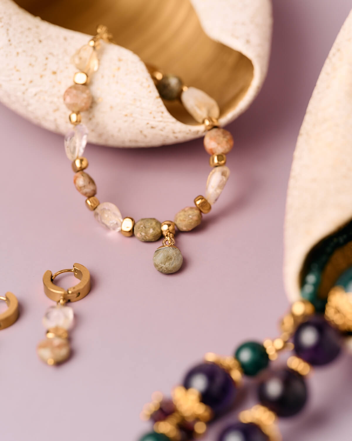 Χάρη στη γήινη παλέτα του και την κομψή δομή του, το Βραχιόλι Desert Harmony μεταβαίνει αβίαστα από χαλαρή καθημερινή χρήση σε εκλεπτυσμένο βραδινό styling. Μπορείτε να το φορέσετε μόνο του για να αναδείξετε τη φυσική του ομορφιά ή να το συνδυάσετε με άλλα βραχιόλια από πολύτιμους λίθους ή σε χρυσαφί τόνους για ένα πολυεπίπεδο look. Επιπλέον, οι ουδέτεροι τόνοι του ταιριάζουν υπέροχα με λινά, απαλά πλεκτά και ζεστά εποχιακά υφάσματα.