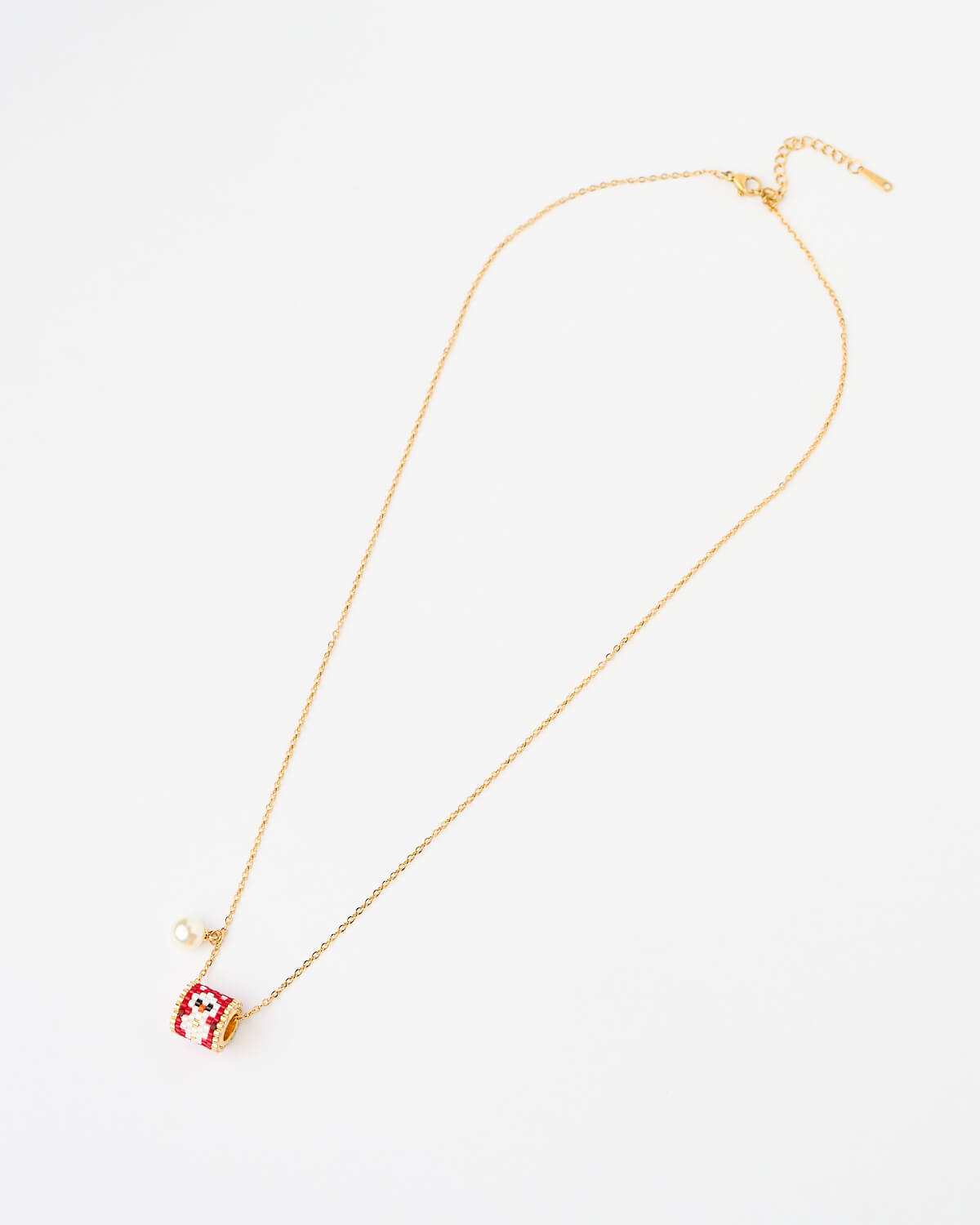 Επιδέξιοι τεχνίτες κατασκευάζουν κάθε χάντρα-σωλήνας χιονάνθρωπου με ακρίβεια, χρησιμοποιώντας υψηλής ποιότητας χάντρες Miyuki, γνωστές για το φωτεινό φινίρισμα και το ομοιόμορφο σχήμα τους. Το σχέδιο του χιονάνθρωπου διαμορφώνεται μέσω της προσεκτικής τοποθέτησης χρωμάτων, η οποία δίνει στο μενταγιόν μια καθαρή, γοητευτική έκφραση. Επιπλέον, το κολιέ περιλαμβάνει μια εκλεπτυσμένη χρυσή αλυσίδα που ενισχύει τους ζεστούς τόνους της χάντρας. Ένα μικρό μαργαριτάρι προσθέτει μια κομψή αντίθεση, δημιουργώντας ένα ισορροπημένο μείγμα παιχνιδιάρικης γοητείας και χαριτωμένου στυλ. Επειδή τα υλικά επιλέγονται με προσοχή, το κολιέ διατηρεί τόσο την ανθεκτικότητα όσο και την ομορφιά του.