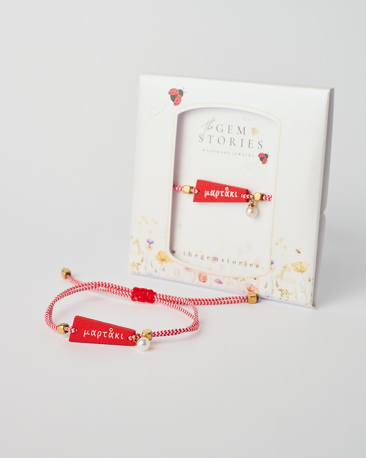 Κατασκευασμένο με κόκκινο και λευκό μακραμέ κορδόνι, αυτό το μαρτάκι αντανακλά την αρμονία, την ισορροπία και τη θετική ενέργεια. Παραδοσιακά, αυτά τα χρώματα συμβολίζουν την προστασία και την καλή τύχη· επομένως προσδίδουν στο σχέδιο έντονο συμβολικό χαρακτήρα. Στο κέντρο, ένα λαμπερό στοιχείο πέρλας προσθέτει απαλότητα και κομψότητα. Επιπλέον, η πέρλα συμβολίζει την αγνότητα, την ηρεμία και τη συναισθηματική διαύγεια, δημιουργώντας μια όμορφη αντίθεση με το ζωηρό κορδόνι. Οι επιχρυσωμένες λεπτομέρειες ενισχύουν ακόμη περισσότερο το βραχιόλι, προσθέτοντας ζεστασιά και εκλεπτυσμένη λάμψη.