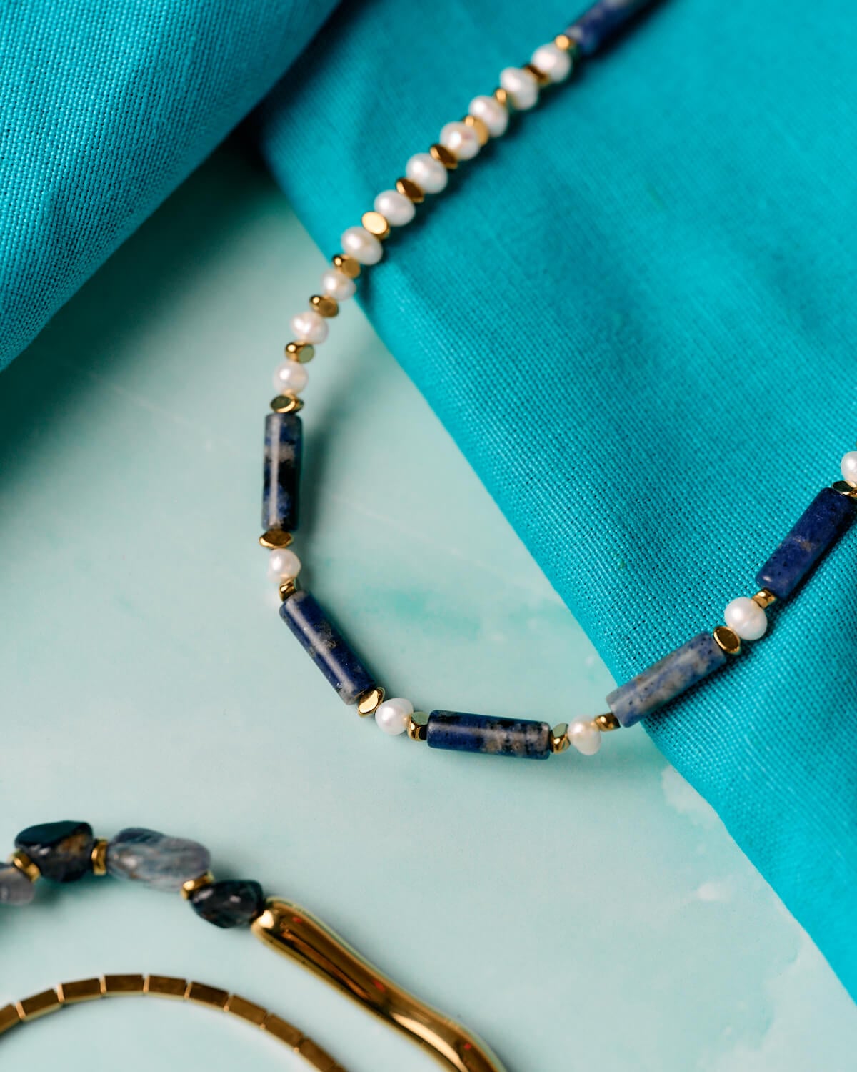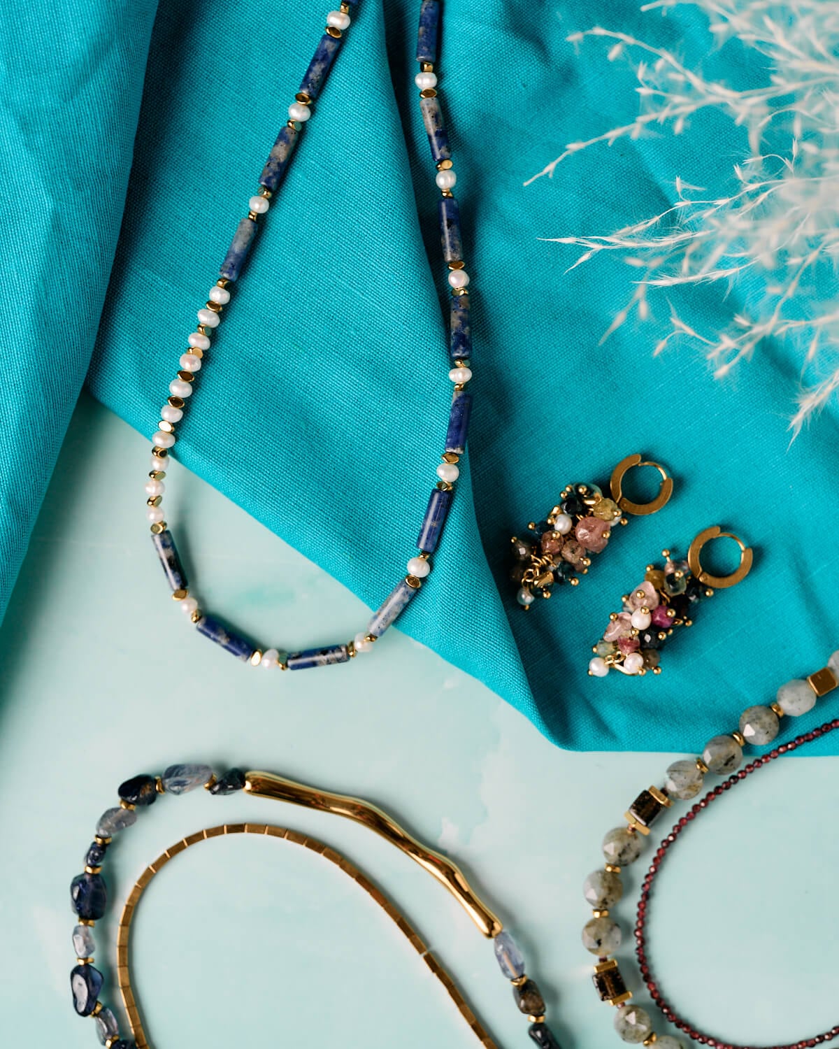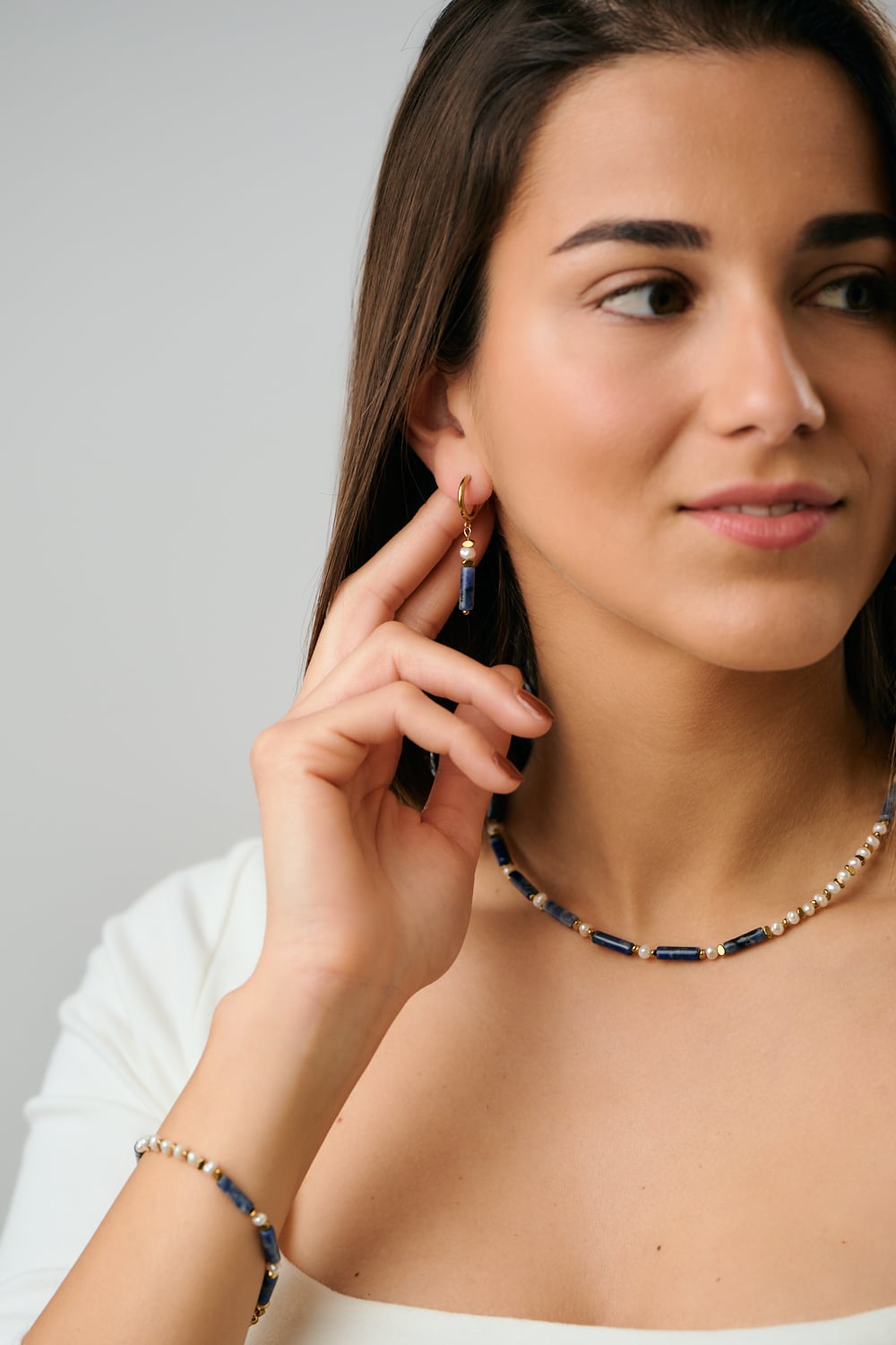 Συμπληρώνοντας τις χάντρες λάπις λάζουλι, τα στοιχεία αιματίτη προσφέρουν μια διακριτική μεταλλική αντίθεση. Το λείο, γυαλιστερό τους φινίρισμα ενισχύει τη συνολική ισορροπία του σχεδίου, προσθέτοντας παράλληλα μια σύγχρονη νότα. Μαζί, αυτοί οι πολύτιμοι λίθοι δημιουργούν έναν αρμονικό συνδυασμό χρώματος και υφής που αποπνέει ταυτόχρονα τολμηρότητα και εκλέπτυνση.