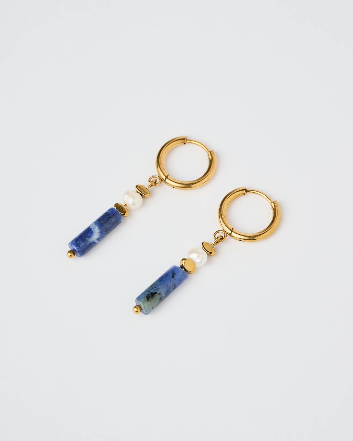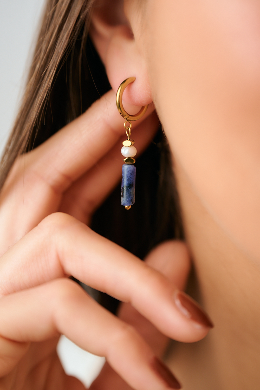 Κοντινή λήψη σκουλαρικιών Λάπις Λάζουλι και μαργαριταριού με χρυσό φορεμένων από μοντέλο του The Gem Stories