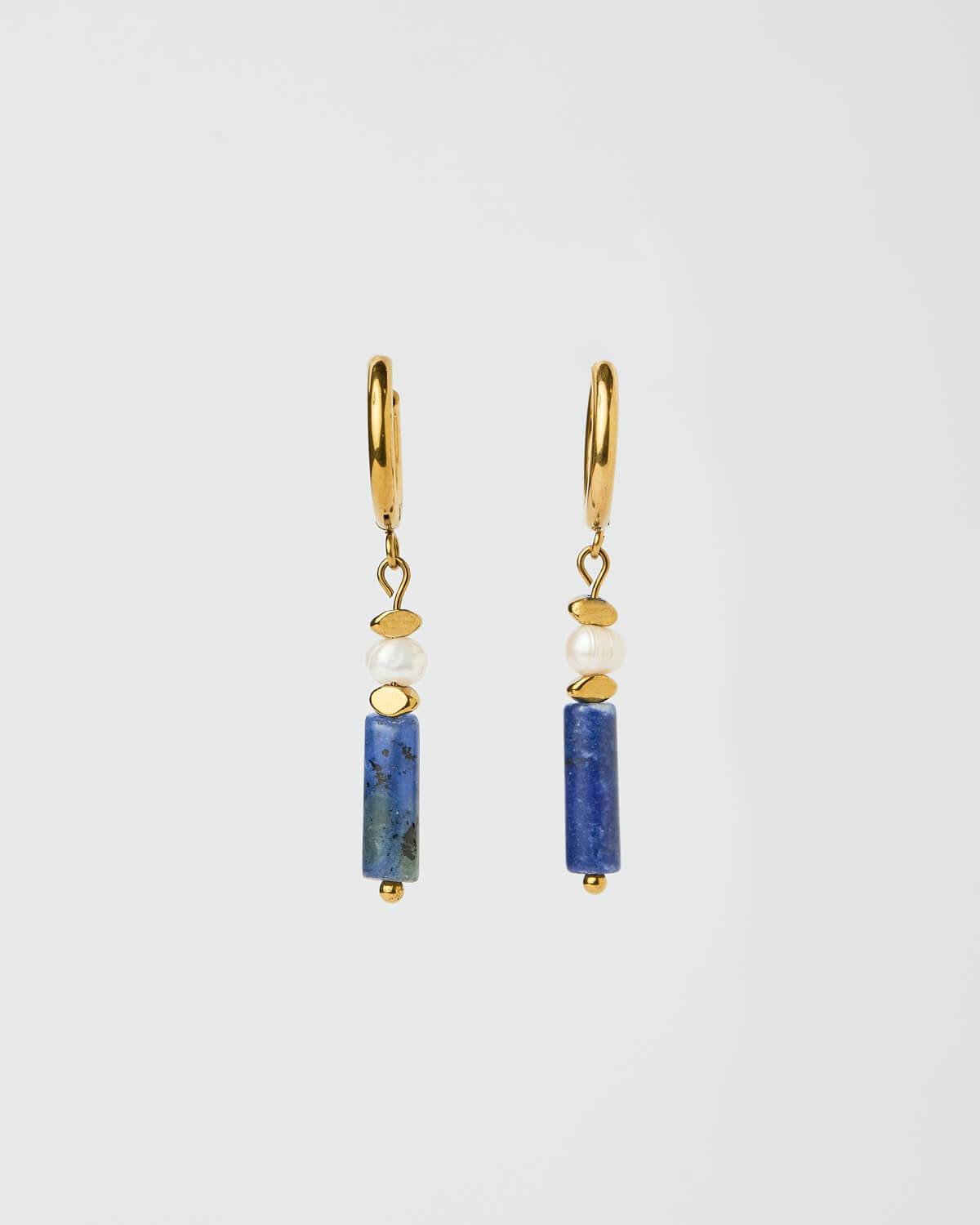 • Κοντινή λήψη σκουλαρικιών Λάπις Λάζουλι και μαργαριταριού με χρυσό φορεμένων από μοντέλο του The Gem Stories