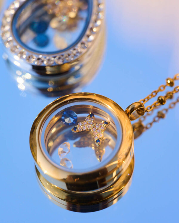 Inside the crystal-clear memory locket rests a gold butterfly charm, its wings gently shimmering with tiny gemstones. Every sparkle reflects hope, joy, and transformation. Above the butterfly, a soft blue crystal adds balance and serenity, symbolizing harmony between strength and peace. Together, they create a radiant composition that tells a story of personal growth and grace.