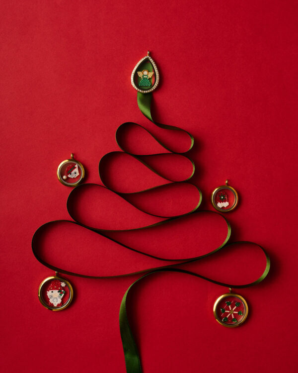 Encased in a gold stainless-steel memory locket, the beaded stocking sparkles behind a crystal-clear window. The transparent case not only protects the detailed beadwork but also allows the colors to shine from every angle. Suspended from a delicate red chain, it adds a festive accent to any outfit, effortlessly blending holiday charm with timeless elegance.