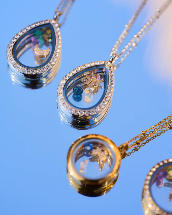 Encased within a silver-plated teardrop locket, adorned with a halo of glistening crystals, the design embodies elegance and serenity. The transparent crystal window protects the tiny treasures inside while allowing them to sparkle with every movement. Suspended from a refined silver chain, the locket rests gracefully against the skin, making it a versatile piece for both day and evening wear.