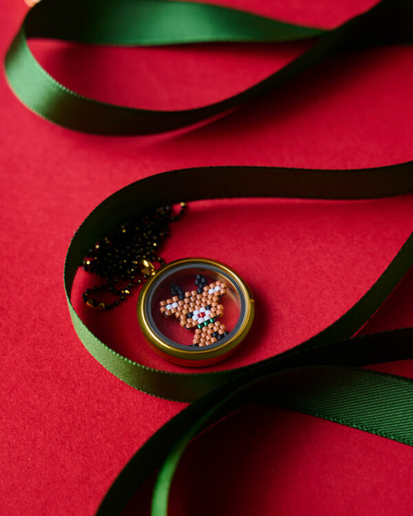 Inside the golden memory locket rests a handwoven reindeer, lovingly crafted from Miyuki beads in shades of brown, red, white, and black. Every bead is carefully placed, forming a cheerful reindeer with a bright red nose — a tribute to the beloved holiday icon. The tiny details give life to a design that celebrates both artistry and festive cheer.