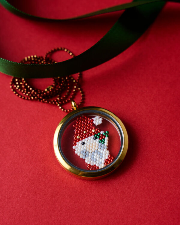 Inside the crystal-clear locket rests a tiny Santa Claus figure, beautifully handwoven from Miyuki beads in classic shades of red, white, and green. Every bead is placed with care, bringing Santa’s cheerful face and signature hat to life. The delicate craftsmanship reflects patience, love, and the joyful spirit of the holidays.