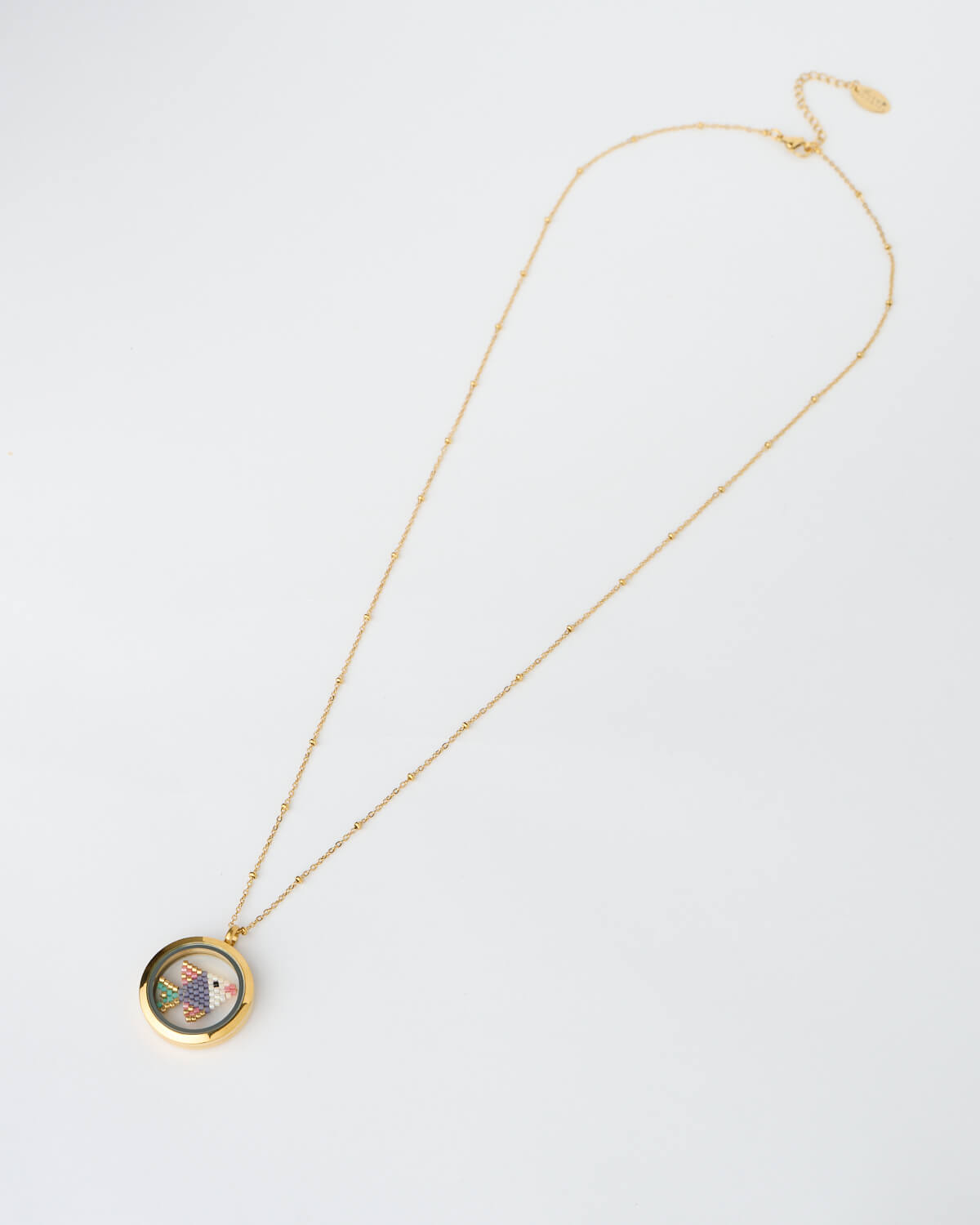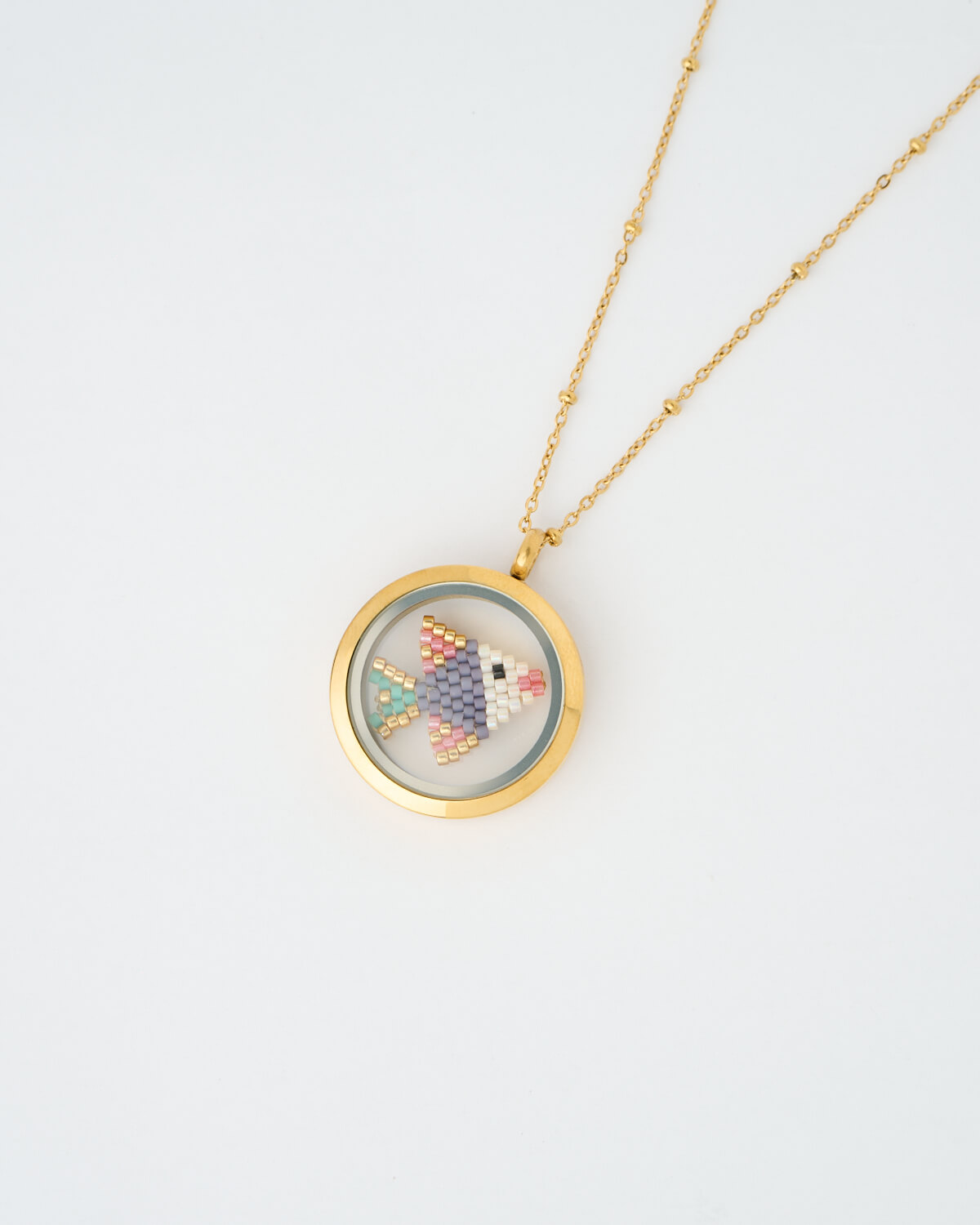 Encased in a polished gold stainless-steel frame, the round locket catches the light beautifully, creating a gentle shimmer that enhances its delicate charm. The soft pastel tones evoke a sense of calm and balance, while the playful fish design adds a joyful touch that brings any outfit to life.