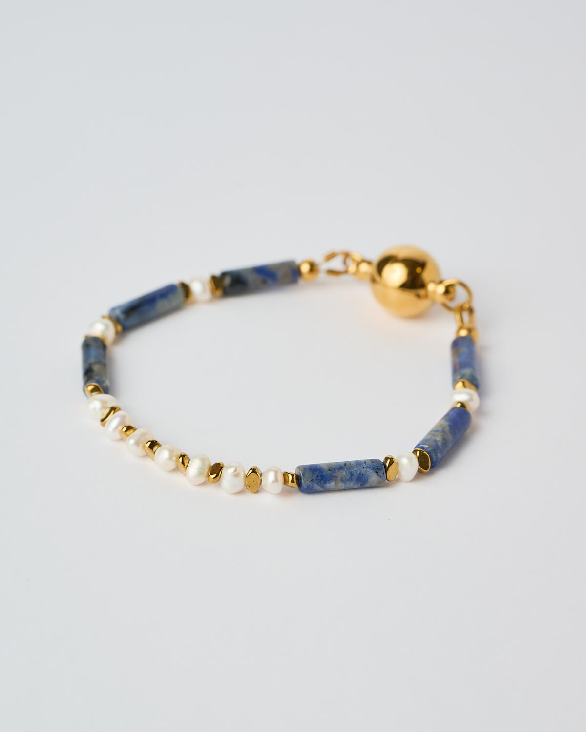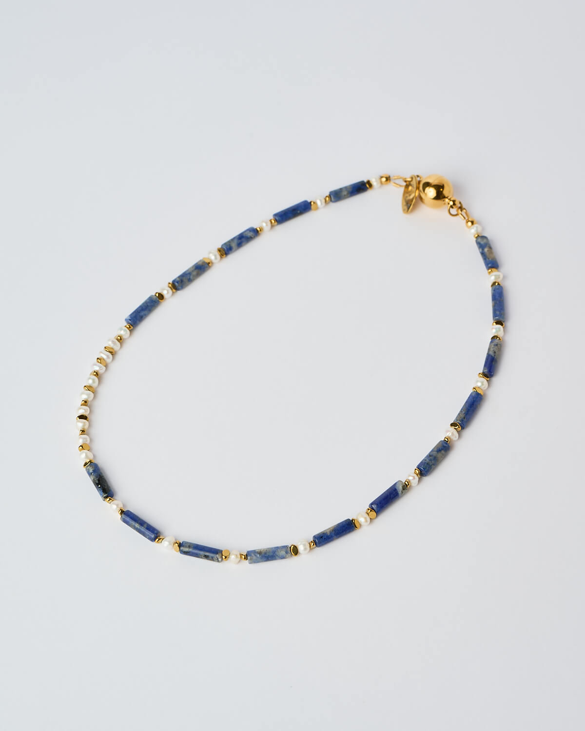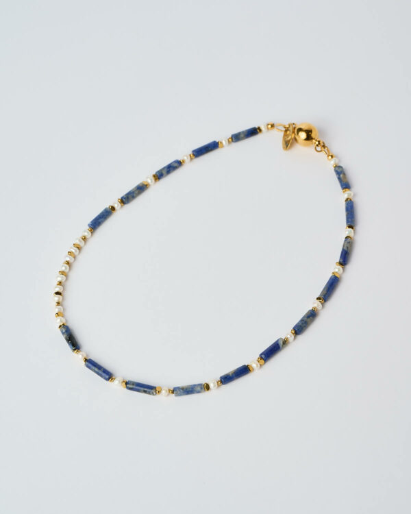 Deep blue Lapis Lazuli, known for its timeless beauty and rich natural texture, brings a sense of calm and sophistication, while Hematite adds balance, grounding energy, and a subtle metallic contrast. Delicate freshwater pearls and gold-plated details complete the design, creating a refined harmony between natural elements and modern elegance.
