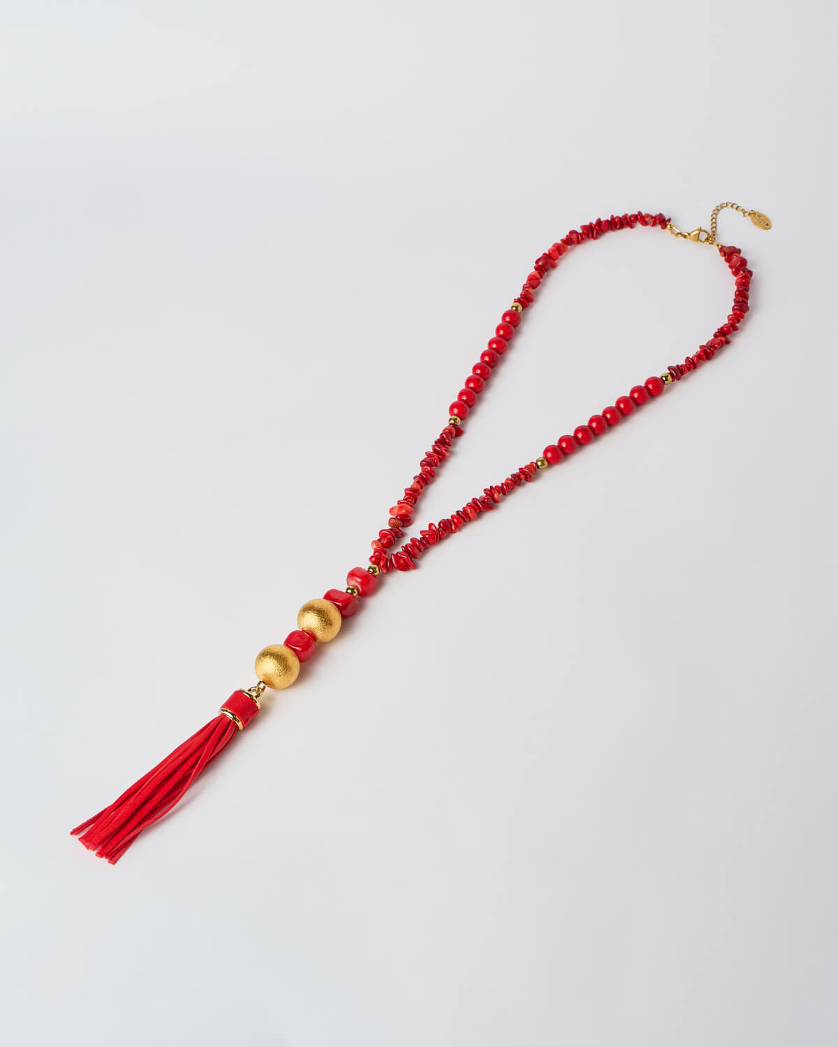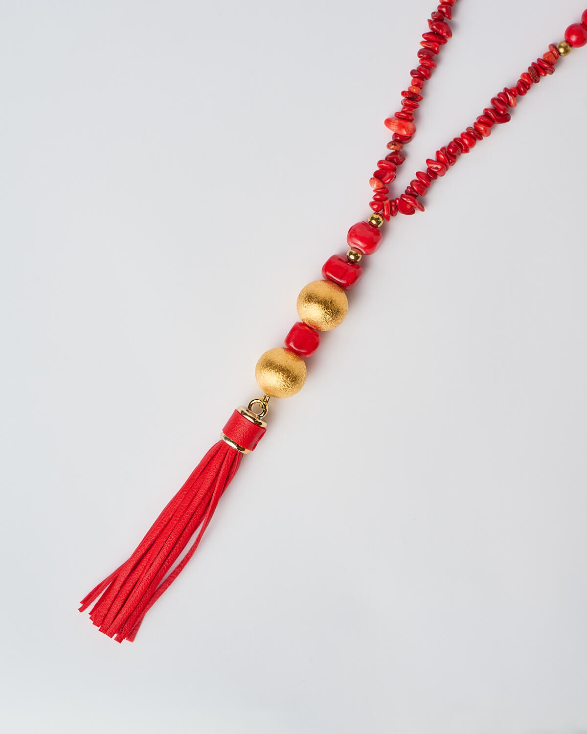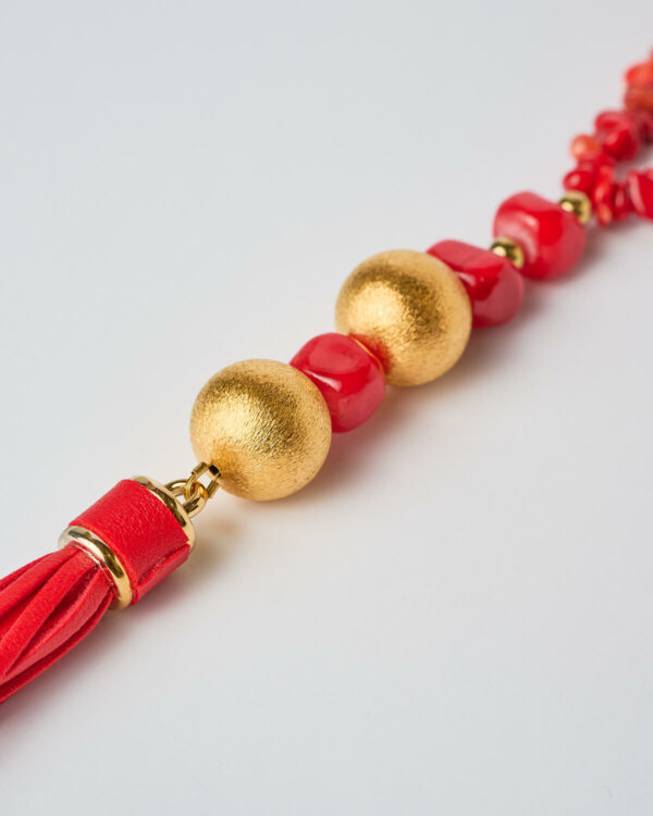 Each necklace is meticulously handmade by skilled artisans who infuse every detail with care and dedication. The design features an exquisite array of red gemstones and beads, chosen for their radiant tones and natural depth. Every bead is carefully arranged to create a sense of rhythm and harmony, while the necklace culminates in a cascading tassel that adds movement and allure to its form.